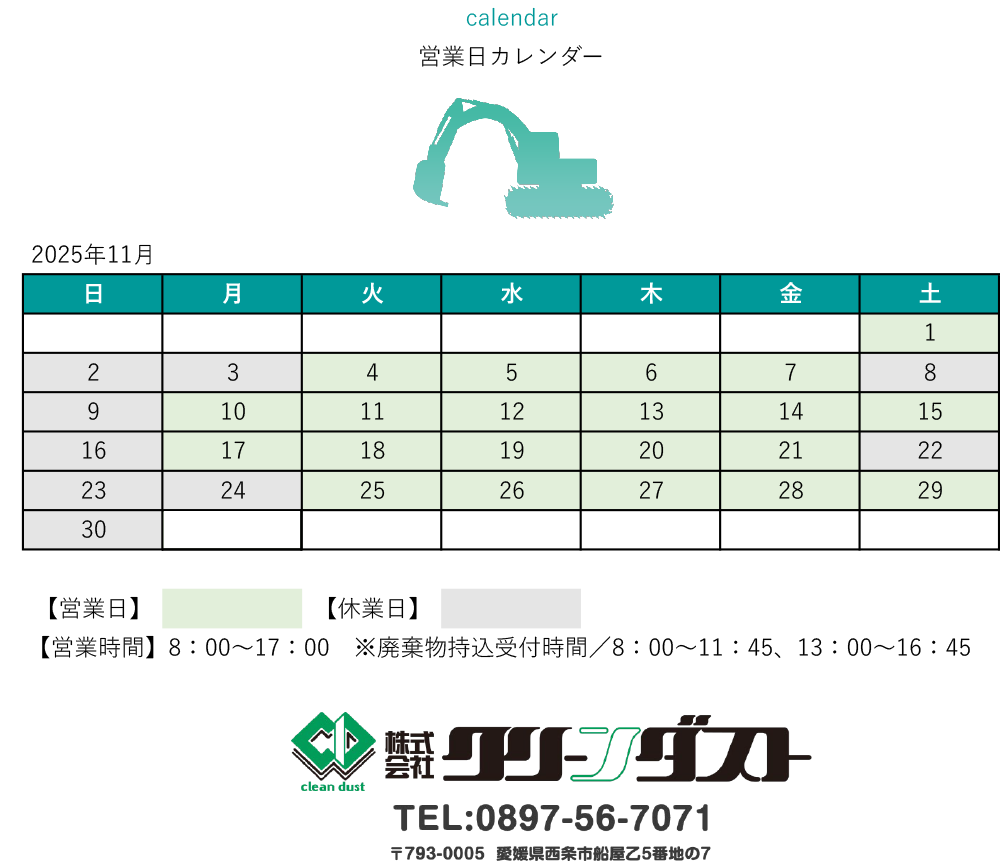 2025年10月・11月の営業日のお知らせ 投稿日 2025年10月1日 更新日 2025年12月1日 著者 admin カテゴリー お知らせ 2025年10月・11月の営業日をお知らせいたします。よろしくお願い申し上げます。
